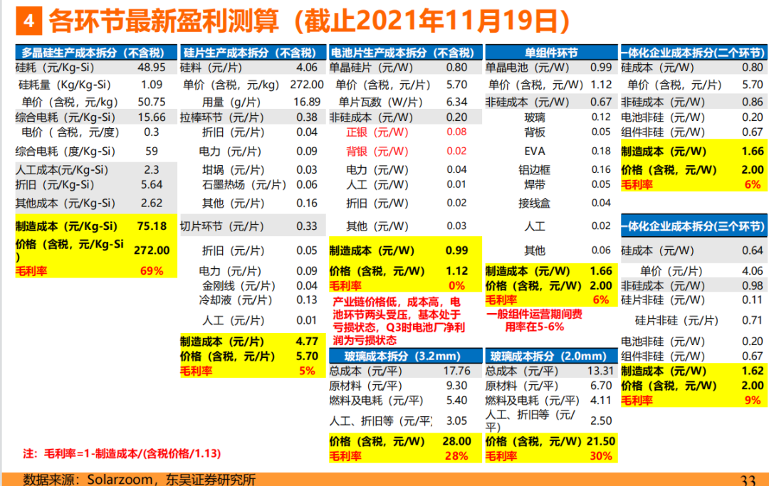 在光伏产业链中,硅片是链条的中游核心,因此具备向下传导硅料涨价压力的能力,这就导致硅片价格也随着硅料持续上涨。由于组件企业的直接客户是终端电站客户,普遍是投标的结果,因此几乎丧失了对其的议价能力,导致光伏产业链下游的电池片和组件厂的利润空间早已被中上游压缩殆尽。