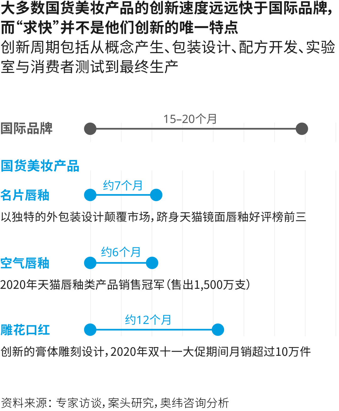 奥纬咨询通过专家访谈、行业调研发现,国际大牌单一新品的研发周期(包括产品创意、包装设计、配方调配、测试生产)在15-24个月之间,而同类中国品牌一般只需要6-9个月。大牌企划期往往以年为单位,但中国品牌以月为单位很是常见。
