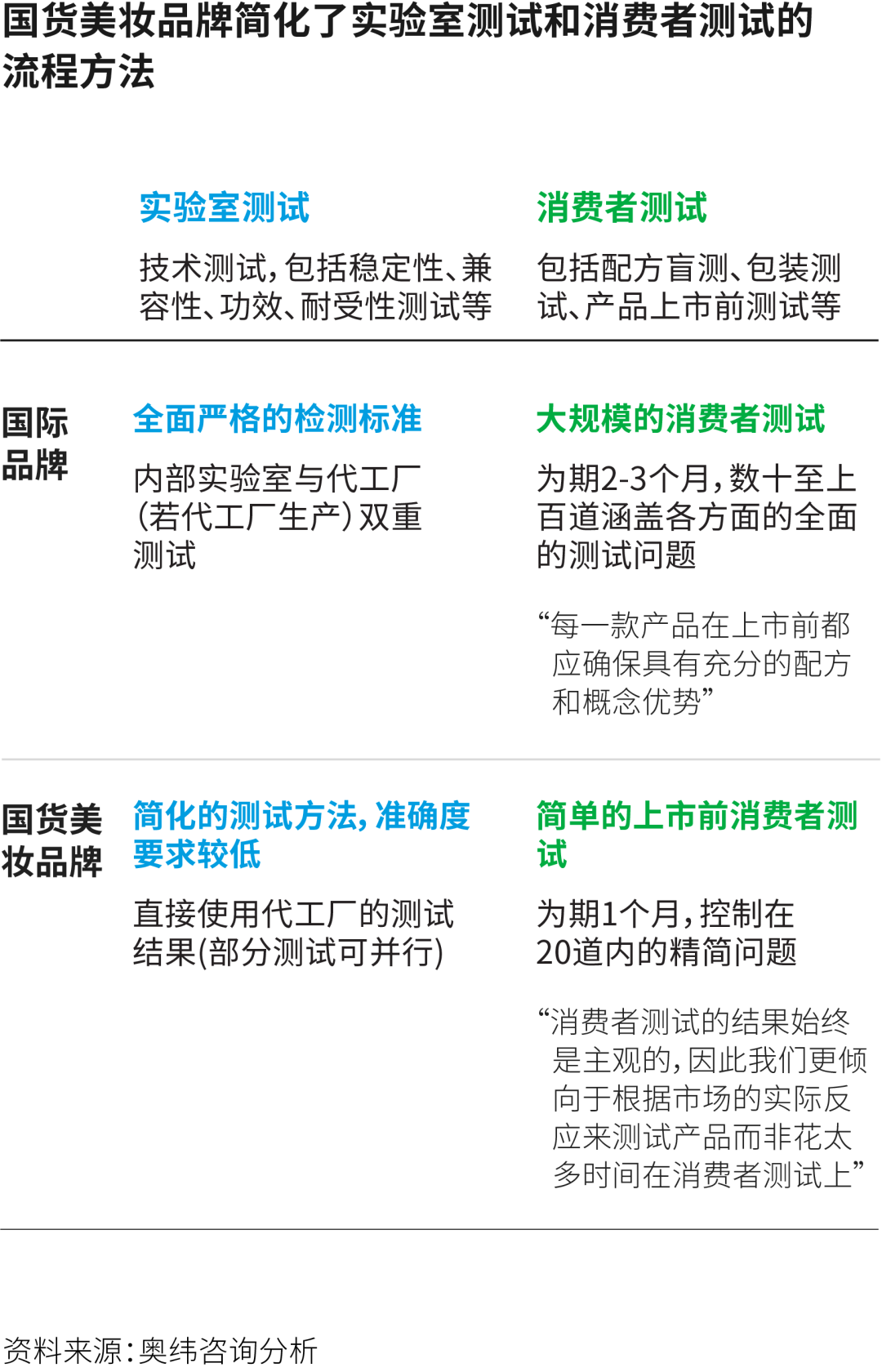 在消费者测试阶段,与国际品牌动辄2-3个月、使用外部调研公司、采用精心设计的数十至上百条问题的问卷、全面的数据分析相比,国货品牌秉持“真正的消费者测试发生在产品上市后”的思路,认为产品上市前小规模的消费者测试难以确保客观性,且并不能为产品带来决定性的改变。因此国货品牌大大缩短测试时间至2-3周,大幅精简问题及数据分析的颗粒度,只求在核心问题上获得消费者的反馈即可。