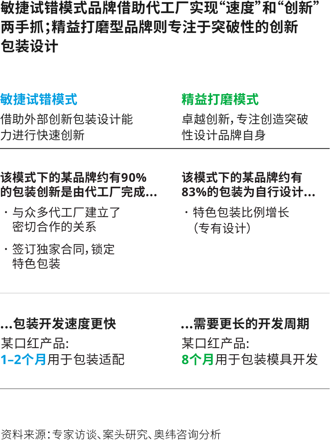 (以两个模式的典型品牌为例,奥纬咨询发现敏捷试错模式下某品牌在2020年注册332款产品,其中42款被推向市场,精益打磨模式下某品牌同年注册69款产品,其中12款和消费者见面。)