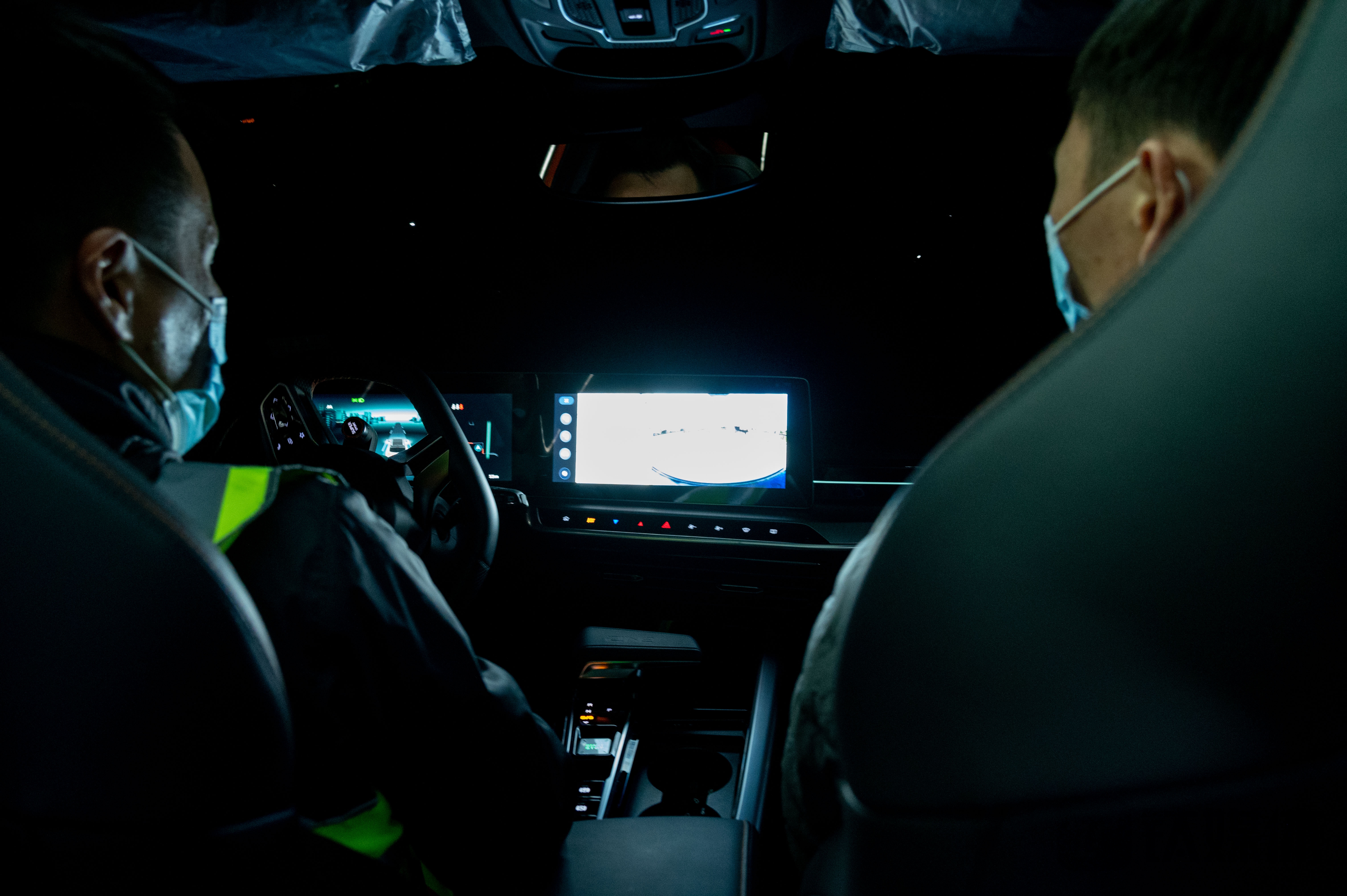在第一个场景中,笔者主要体验了“盲驾”,当然这并不是真的“闭眼开车”,而是用遮光布将车辆的周围窗户全部挡住,让车子原本四面八方开阔的视野变为0能见度。这种情况下,车辆的周围的摄像头就成为了真正的“眼睛”需要通过它们来进行周围环境的观察。