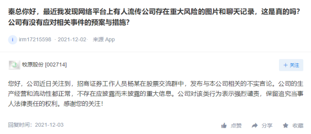尽管该员工此后反复澄清自己所述为道听途说,没有任何依据,但相关言论还是被投资者放到互动平台用于咨询上市公司。对此,牧原股份回复称言论不实,公司生产经营和流动性都正常。
