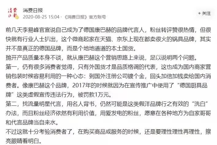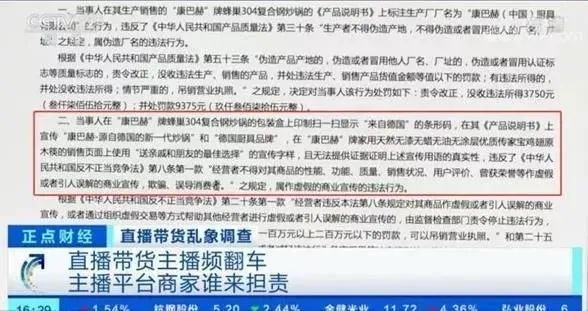 无独有偶,几乎同一时间,央视《正点财经》节目发布了一期针对直播带货乱象调查的报道,网红厨具品牌“康巴赫”,因为借“德国品牌”名号进行虚假宣传,被央视作为反面教材。