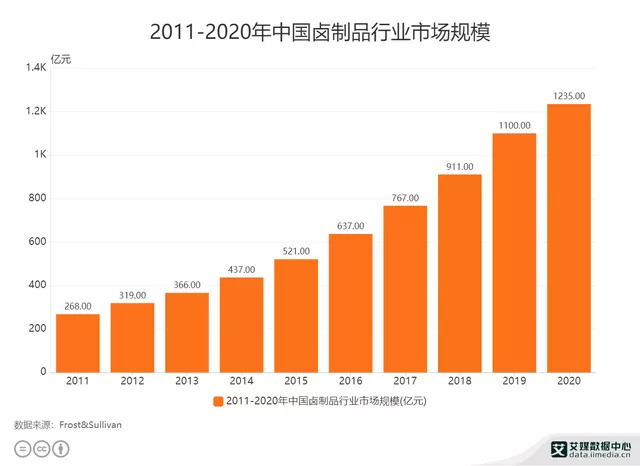 相关数据显示,2020年我国休闲卤制品市场规模达1235亿元,2015-2020年平均增长率为18%,是休闲食品中增速最快的品类。预计未来五年将以每年13%的增长率持续提升,到2025年卤味市场规模将突破2200亿元。