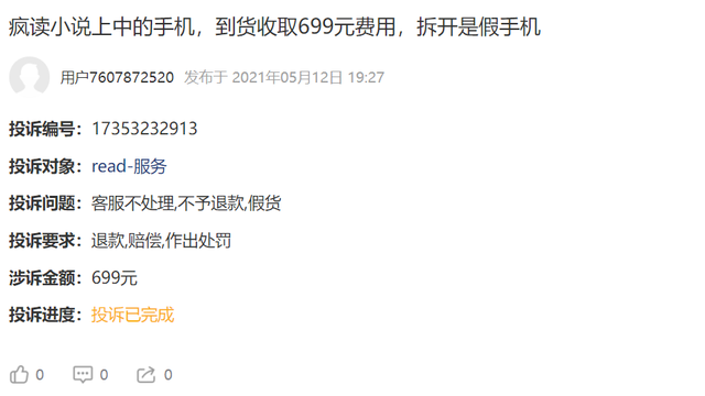 在黑猫投诉平台上,关于“疯读小说”的投诉有163条,其中虚假广告、虚假宣传、诱导消费等字眼多次出现。更有网友好不容易集齐了手机碎片并换取手机,但却在签收时被收取费用,后又发现手机根本无法使用的情况发生。