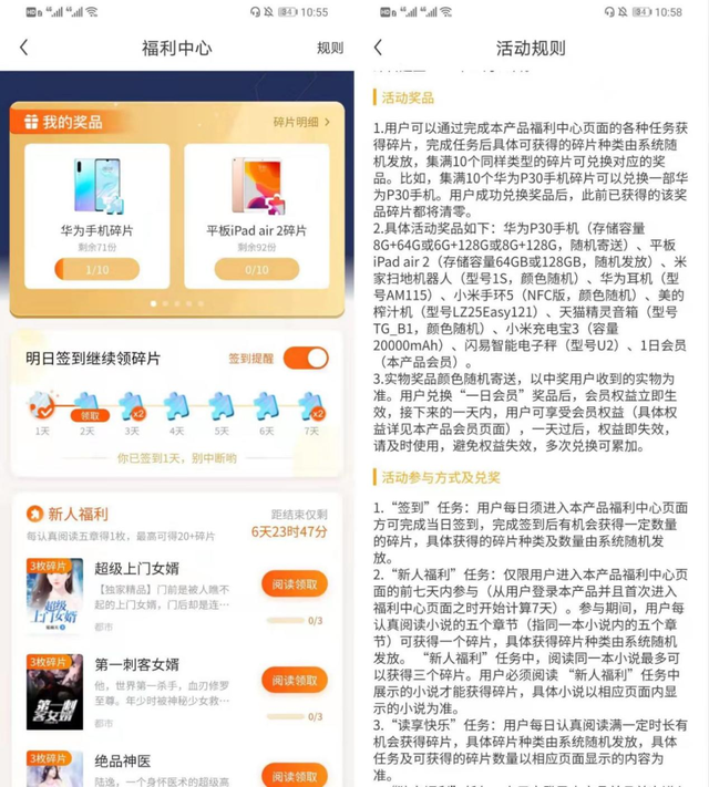 在疯读小说“福利中心”内,用户通过每日签到和阅读规定时间的小说后可以获得碎片,并用这些碎片兑换手机。