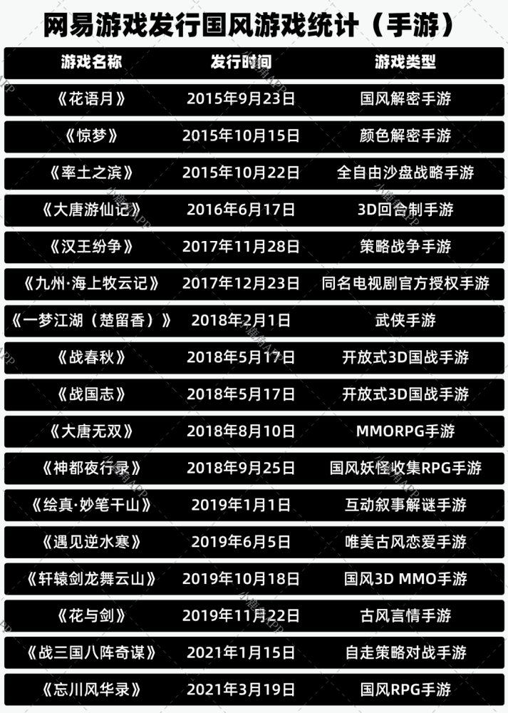 从女性向的古风言情、解谜类,到男性向的MMORPG、策略对战,在国风游戏这个足够庞大的框架下,能够装下无限多的类型。此前网易推出对标“中国版阴阳师”的“唐风妖怪收集手游”《神都夜行录》,腾讯随即推出了唐风妖怪手游《云梦四时歌》。腾讯今年上线了以《山海经》为题材的开放世界国风游戏《妄想山海》,网易则推出了改编自B站同名国风音乐企划的《忘川风华录》。