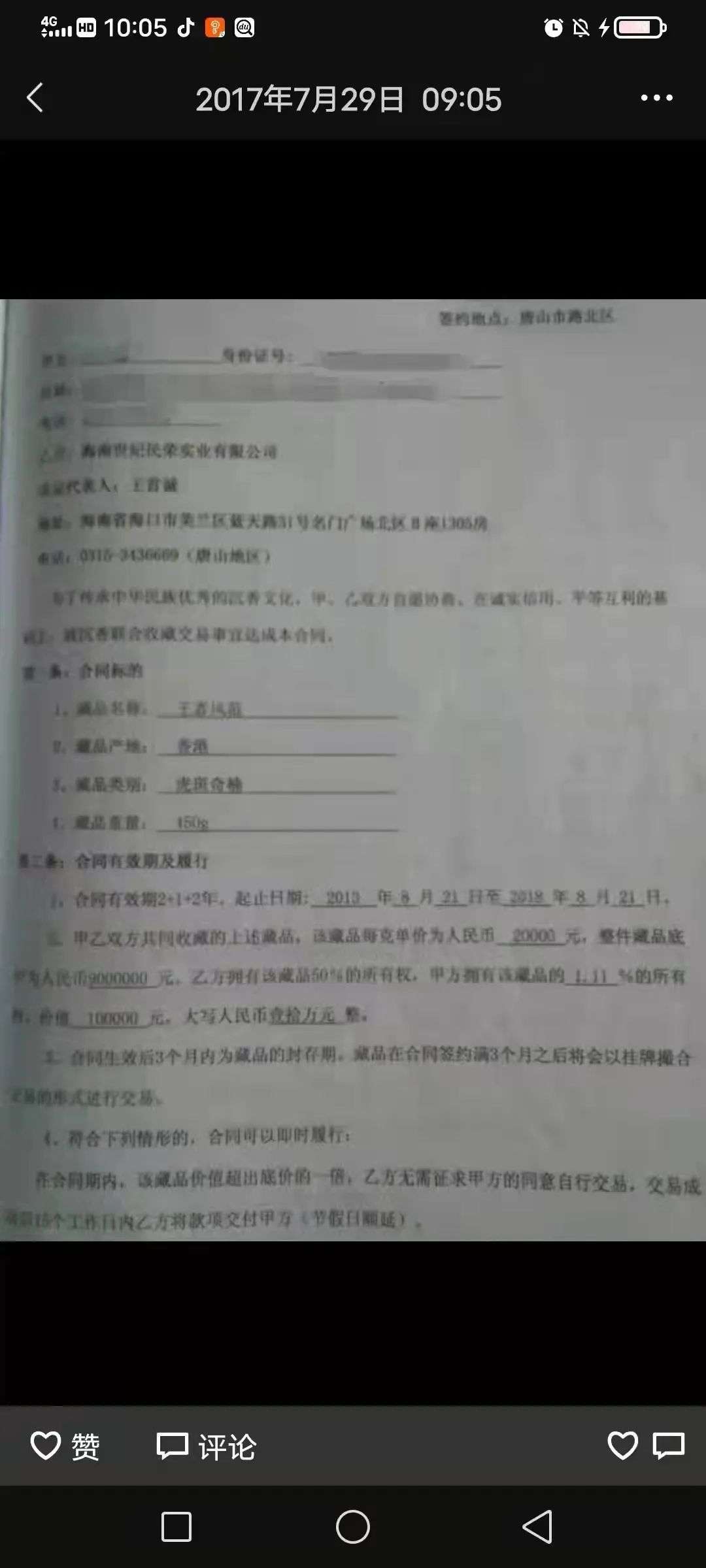 这份合同,田恬后来才在姥爷朋友圈看到。上面显示,黑茶单价每克是2万元,整件藏品价格900万元,发行公司拥有该藏品50%的所有权,出资10万元的姥爷,拥有1.11%的所有权,但具体收益,却没在合同上体现。
