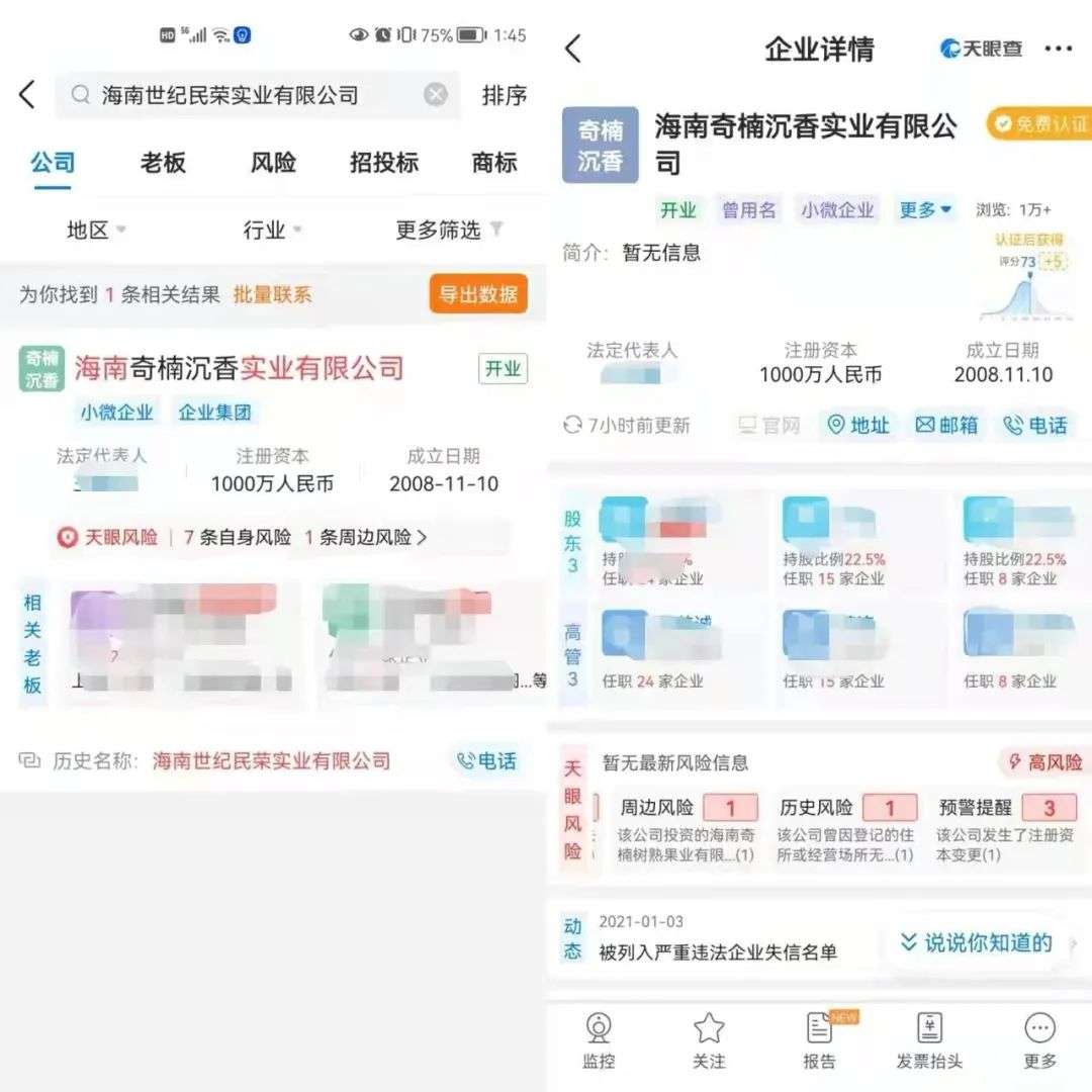 为了给姥爷维权,田恬去天眼查查询公司信息。她惊讶地发现,售卖黑茶的海南世纪民荣实业有限公司已经改名为海南奇楠沉香实业有限公司,与提供沉香投资的海南奇楠沉香电子商务有限公司,都是同一个法人,而且上述公司已被列入严重违法失信企业名单。