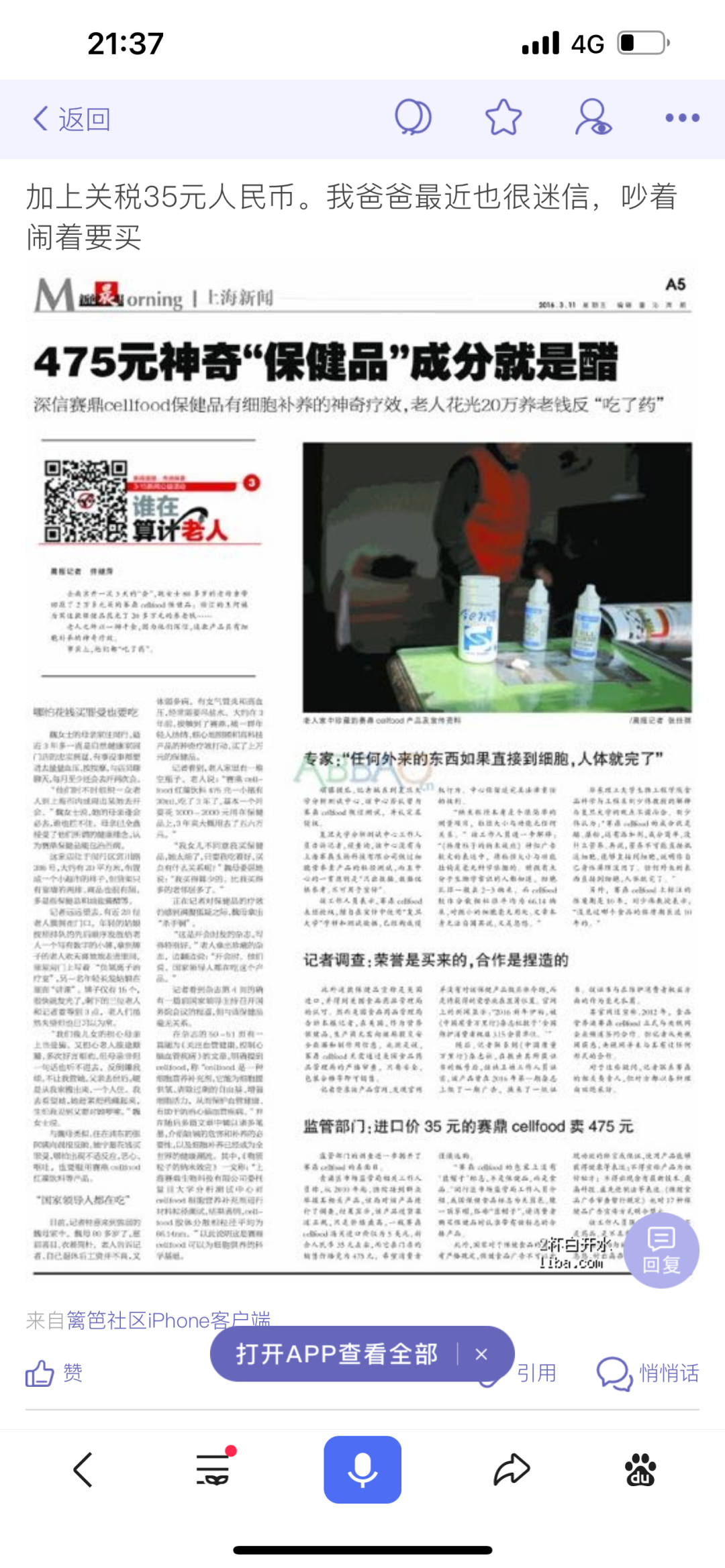 其实,早在2014年,上海《新闻晨报》就曝光过这款植物饮料,称其真实成分就是醋。按照报道,这个产品就算是进口赛鼎,其进口价也就35元左右,而叶文父母的买入价,竟然高达475元。