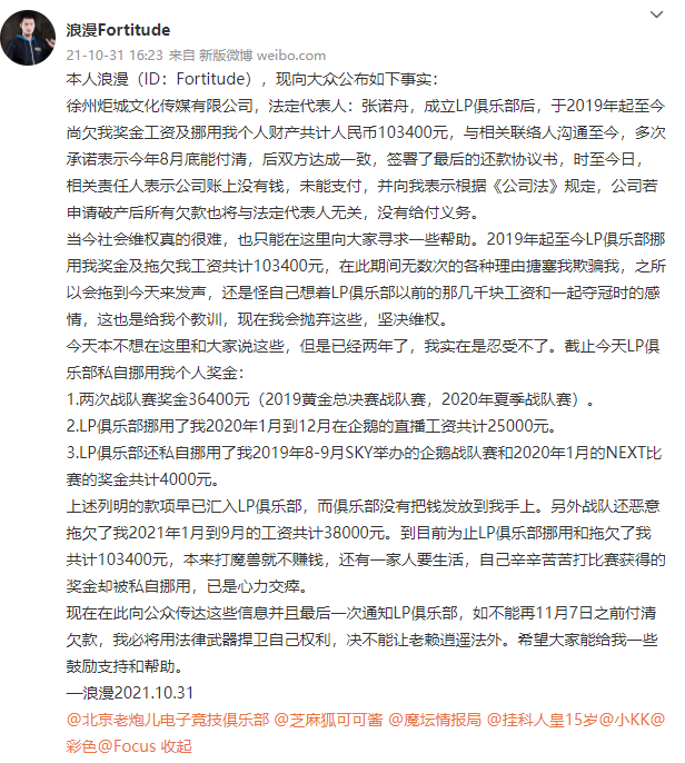 顶级选手如此,一些非顶级的知名选手更惨,10月31日,选手浪漫在微博发布LP俱乐部欠薪相关内容,总计103400元。