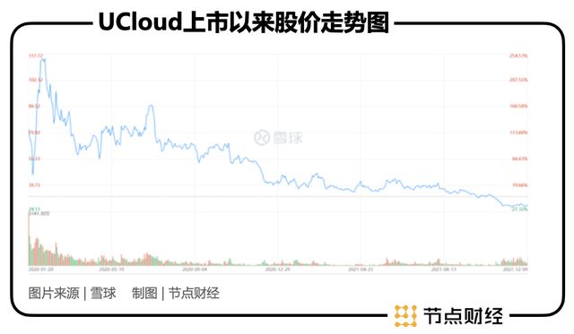 然而好景不长,在股价达到126元/股的历史高点后,UCloud随即开启了漫长的下跌之路,目前每股仅为28.74元,已经击穿发行价,总市值也徘徊在120亿元左右,实实在在地上演了一场“出道即巅峰”的尴尬旅程。