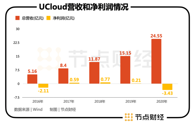 公开资料显示,2016年-2020年,UCloud的总营收分别为5.16亿元、8.40亿元、11.87亿元、15.15亿元和24.55亿元,呈现出快速上涨的态势。但期间净利润分别为-2.11亿元、0.59亿元、0.77亿元、0.21亿元和-3.43亿元,与一直保持稳定高速增长的营收表现则好像又不匹配。