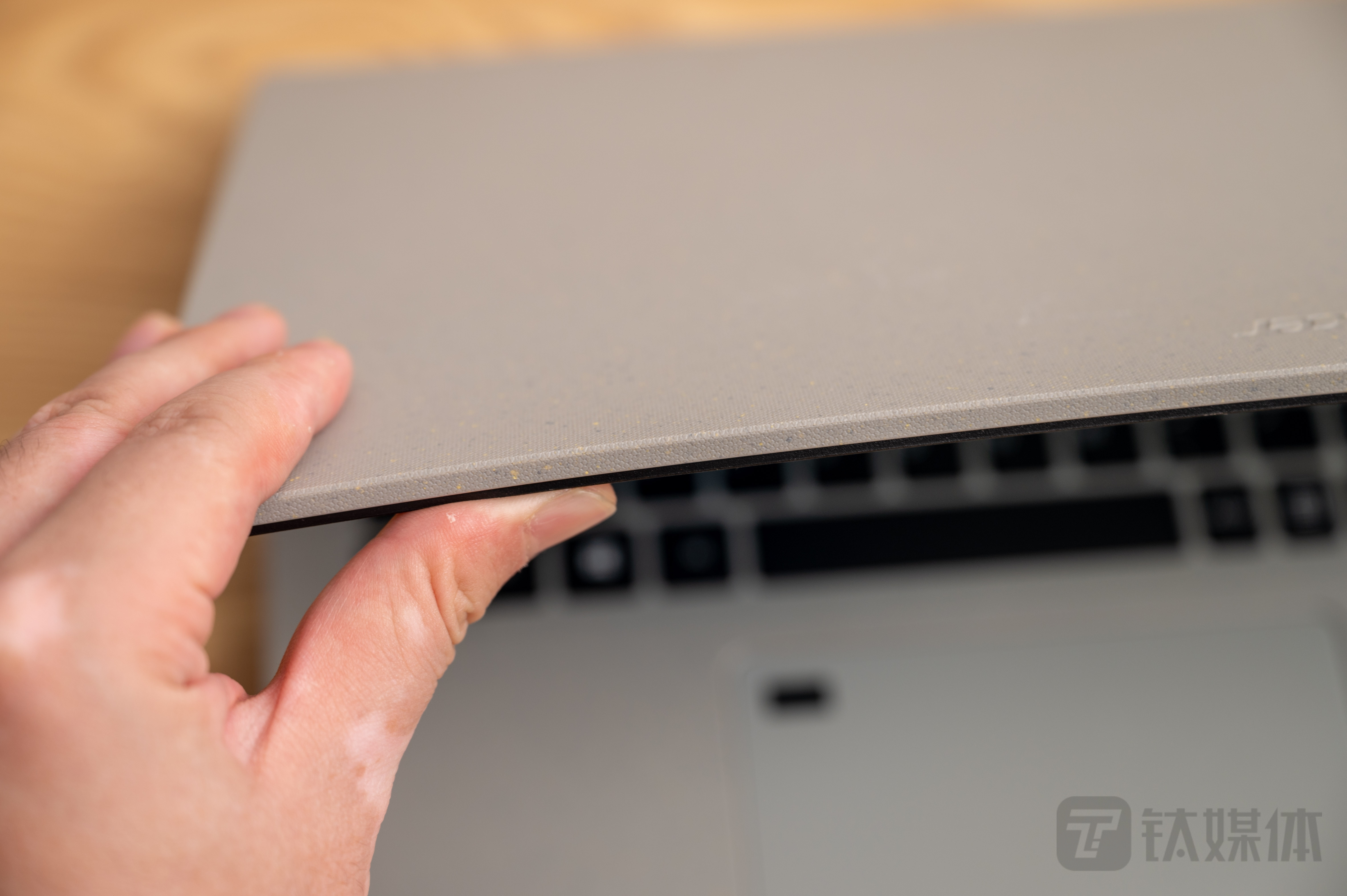实际体验中,笔者发现PCR塑料具备不错的韧性,用手指按压顶盖边缘会看到有一定的变形,而整个笔记本相比同类全金属产品更加厚实的结构,也是为了避免断裂等问题,如果在单手开启上盖的时候发现顶盖有点弯,完全不用担心,这是正常的情况。