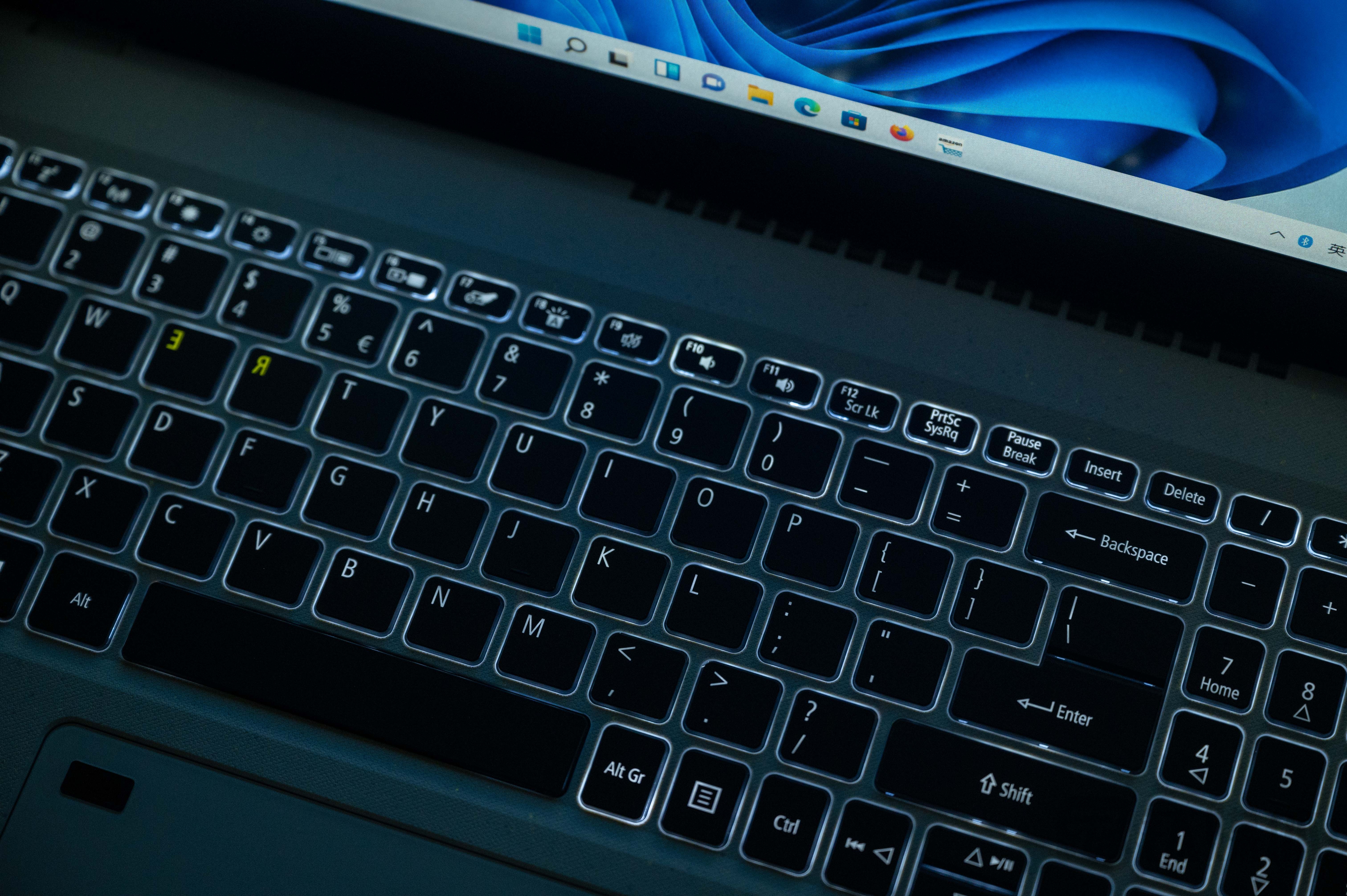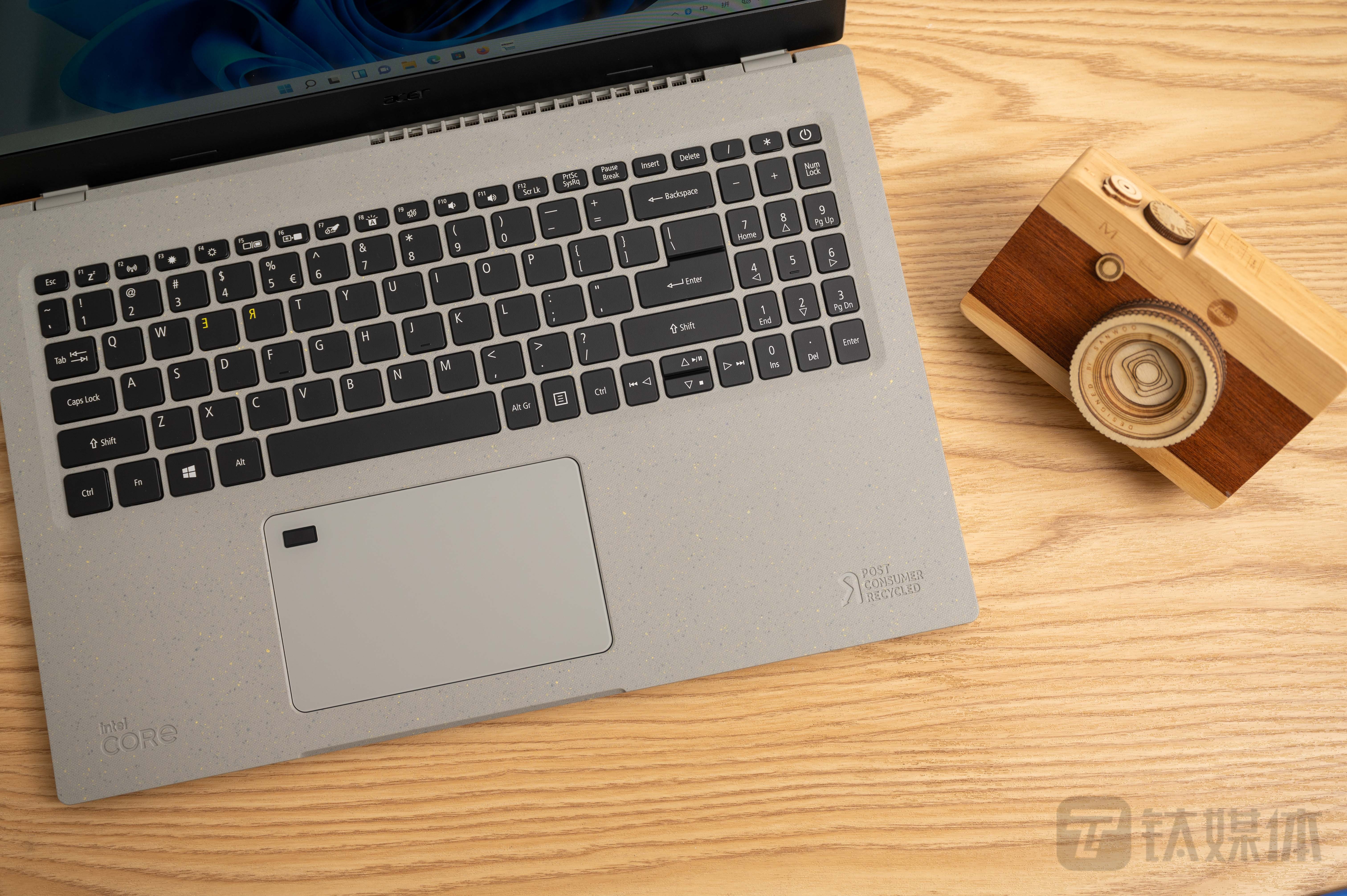 此外,在键盘区还能看到一个小彩蛋,键盘上的E、R两个按键的字符是反的,并且颜色也有所区分,这可不是加工失误,而是宏碁特别为其加入的设计元素。两个字符对应着Reduce减少、Reuse再利用和Recycle再循环的前缀词根和寓意,不仅再次提倡了环保理念,同时也为产品融入了一种独特的辨识性设计。