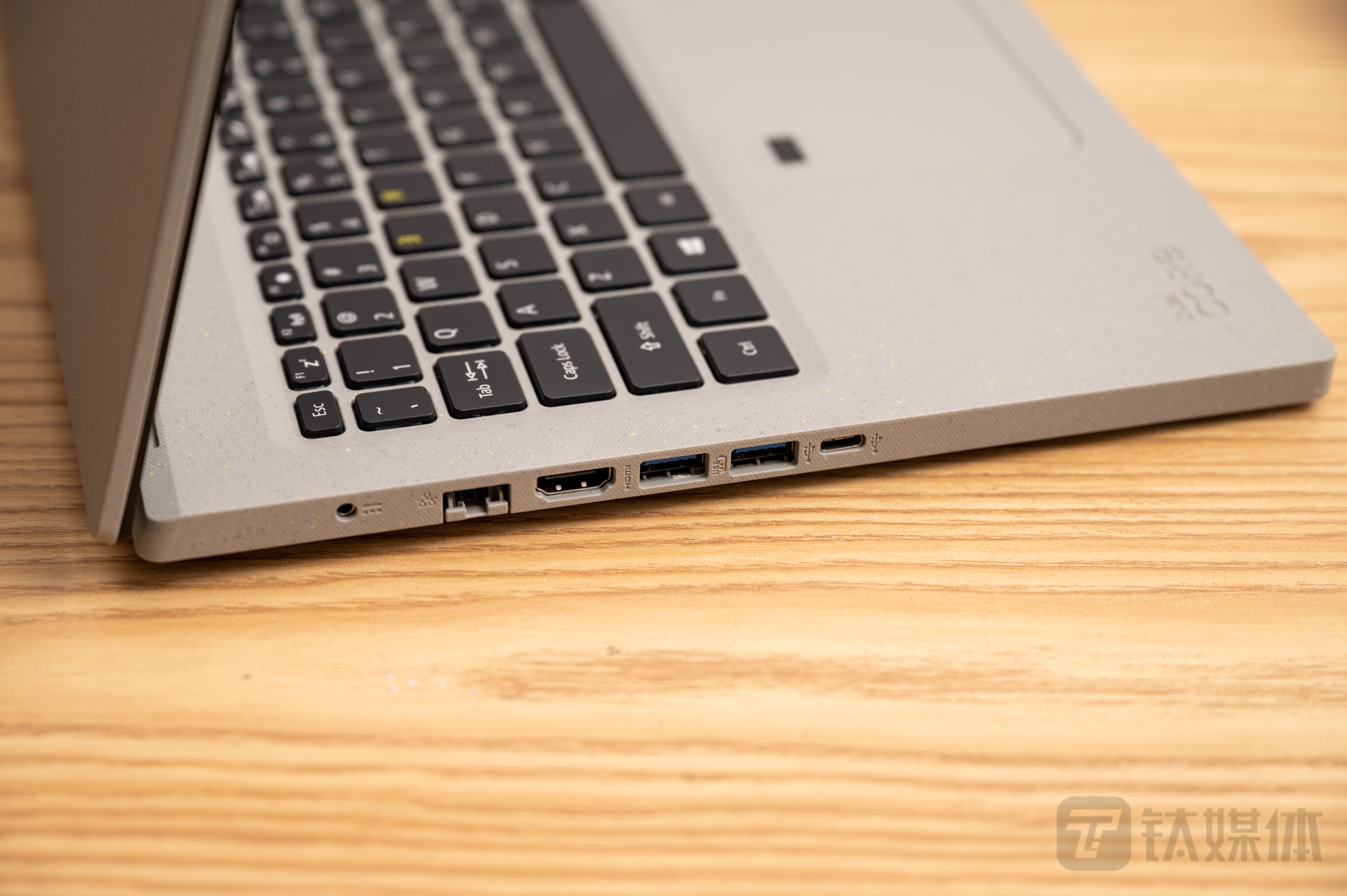 作为笔记本电脑领域的老玩家,宏碁也没有忘记接口、键盘等细节设计,这款产品的接口非常全面,包括RJ45网口、HDMI视频输出接口、3个USB-A接口、1个USB-C接口以及3.5mm耳机麦克风二合一接口。