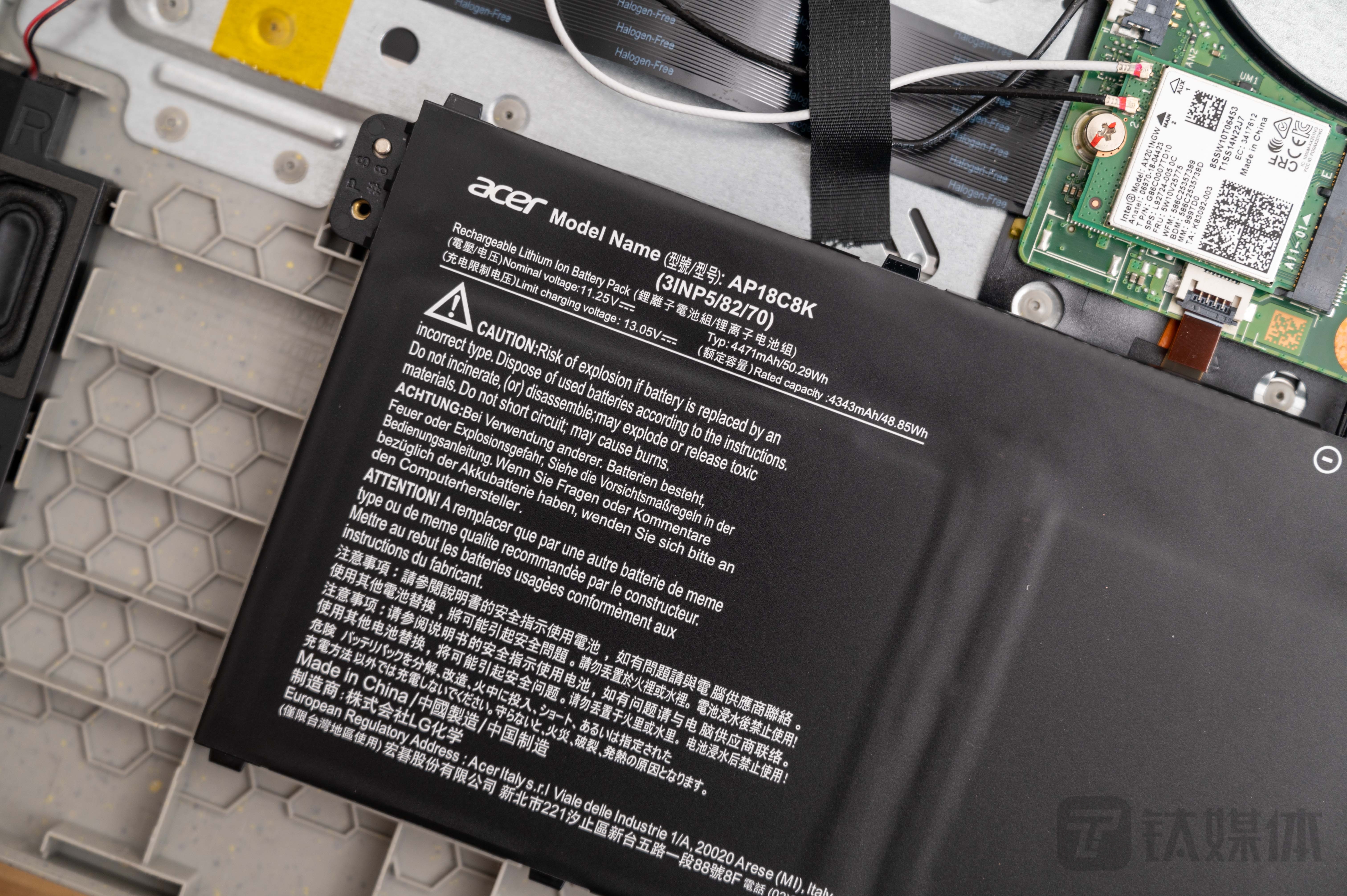 除了屏幕,宏碁蜂鸟·未来环保版笔记本续航方面的表现也比较一般,机内电池的容量达到了50.29Wh,对于一款15.6英寸的产品来说容量还是偏小了一些。并且从整体的空间布局来看,宏碁预留了很多的空间,电池容量应该是可以提升到60Wh以上的,但估计是处于重量、散热等因素的考量,估计在下一代产品中这些都会得到补足。