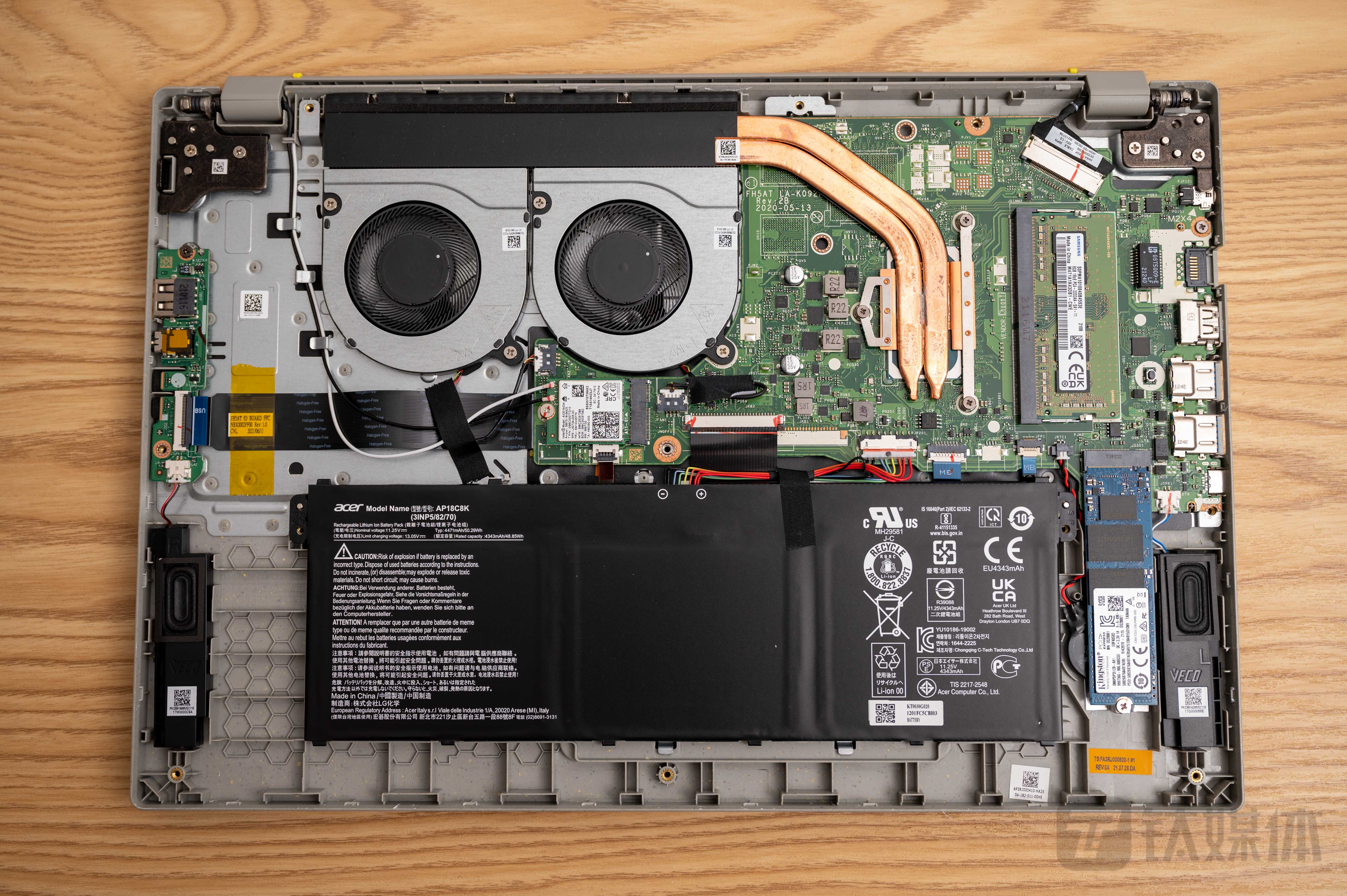 应用环保材料以后,散热也是这款产品设计当中会遇到的问题,拆开后盖板可以看到,即便只是一款采用核显、低压U的产品,宏碁还是为其配备的了双热管+双风扇的设计,散热方面非常豪华,甚至这套散热模组压制TDP 35W以上的标压产品应该也是没有问题的。