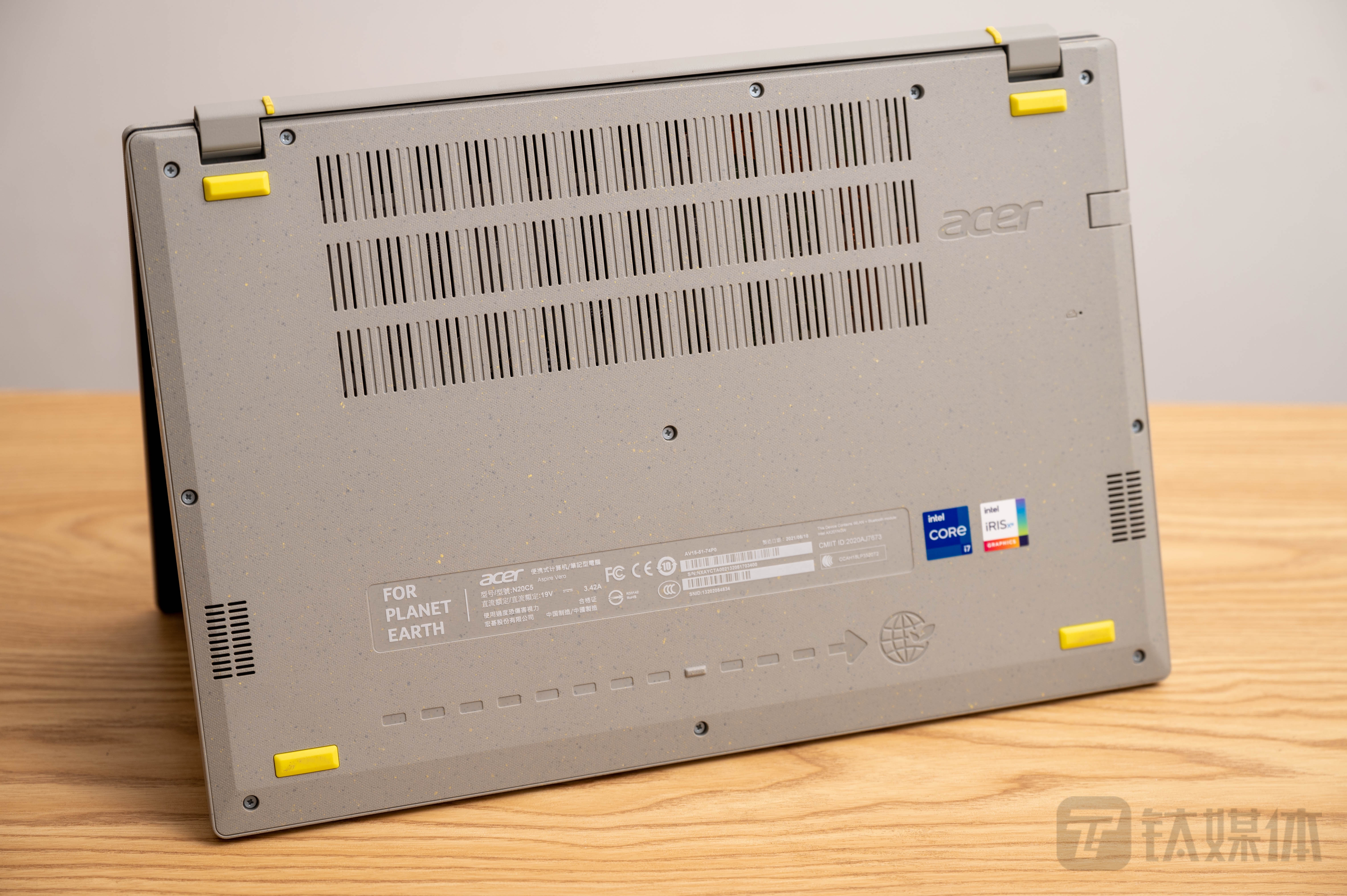 在键盘右下方,宏碁为产品加入了PCR环保标识,并且采用的也是冲压工艺,而非传统的贴纸,这样也可以减少纸张、塑料、粘合剂的使用,应该说是将环保理念真正融入了细节设计内。