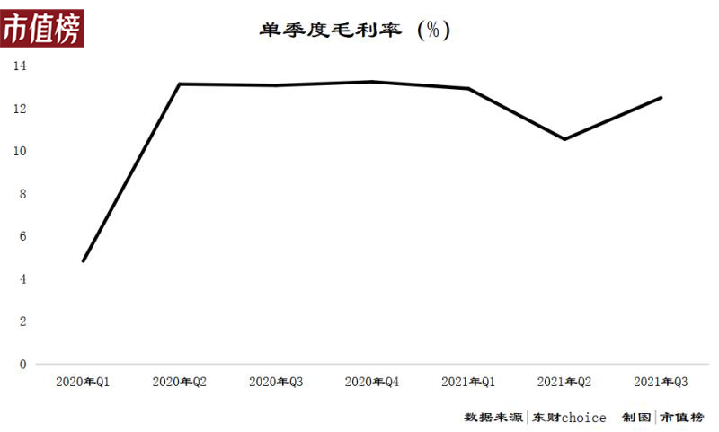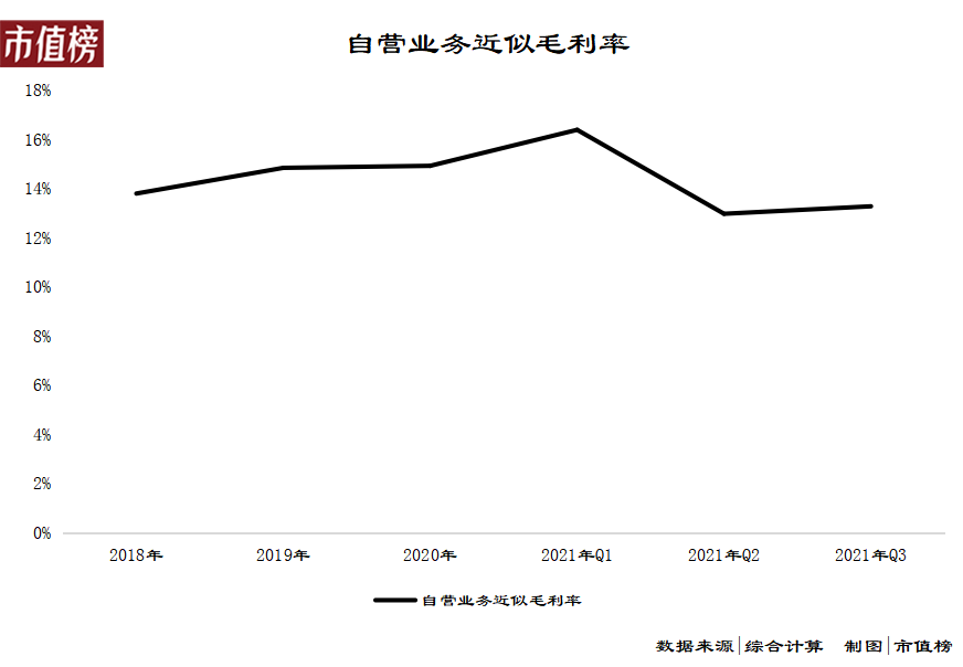 回到加价幅度上。市值榜以利润表中的商品成本(包括所购产品的成本和入库费用)和商品销售收入计算,可得出一个近似为自营业务毛利率的数值。