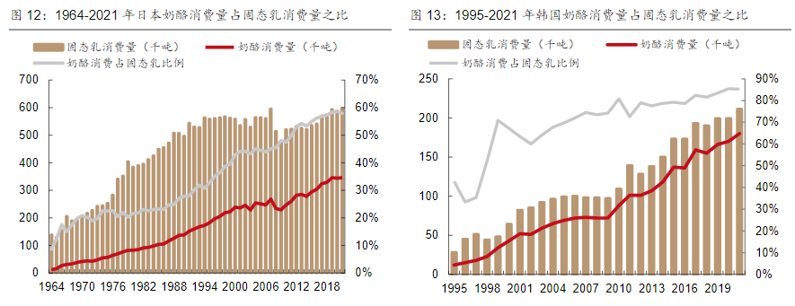 日韩的乳制品也都经历了奶粉—液态奶—固态奶的消费升级之路。其中奶酪作为固态奶中的主导性产品,在这一过程中发挥了不可忽视的作用。