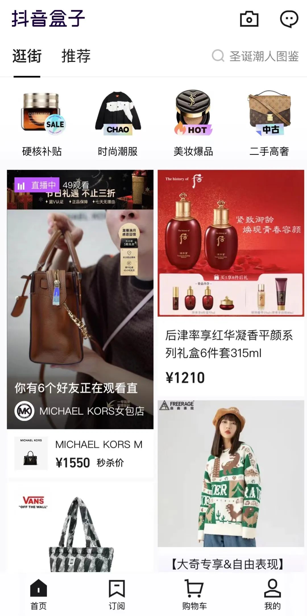 相比抖音商城,抖音盒子的界面设置,菜单更简洁,首页逛街一栏下只有四个子菜单,分别是:硬核补贴、时尚潮服、美妆爆品、二手高奢。能够想象到,他们在努力贴合年轻人的兴趣。