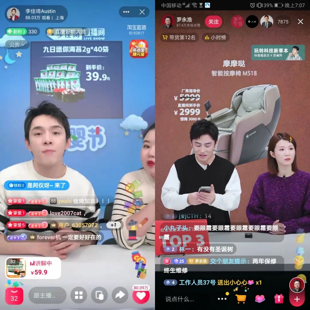 字母榜注意到,昨天晚间,李佳琦和罗永浩分别在淘宝和抖音正常开播;辛巴上一次直播是12月16日,同时预告下周六再次开播。