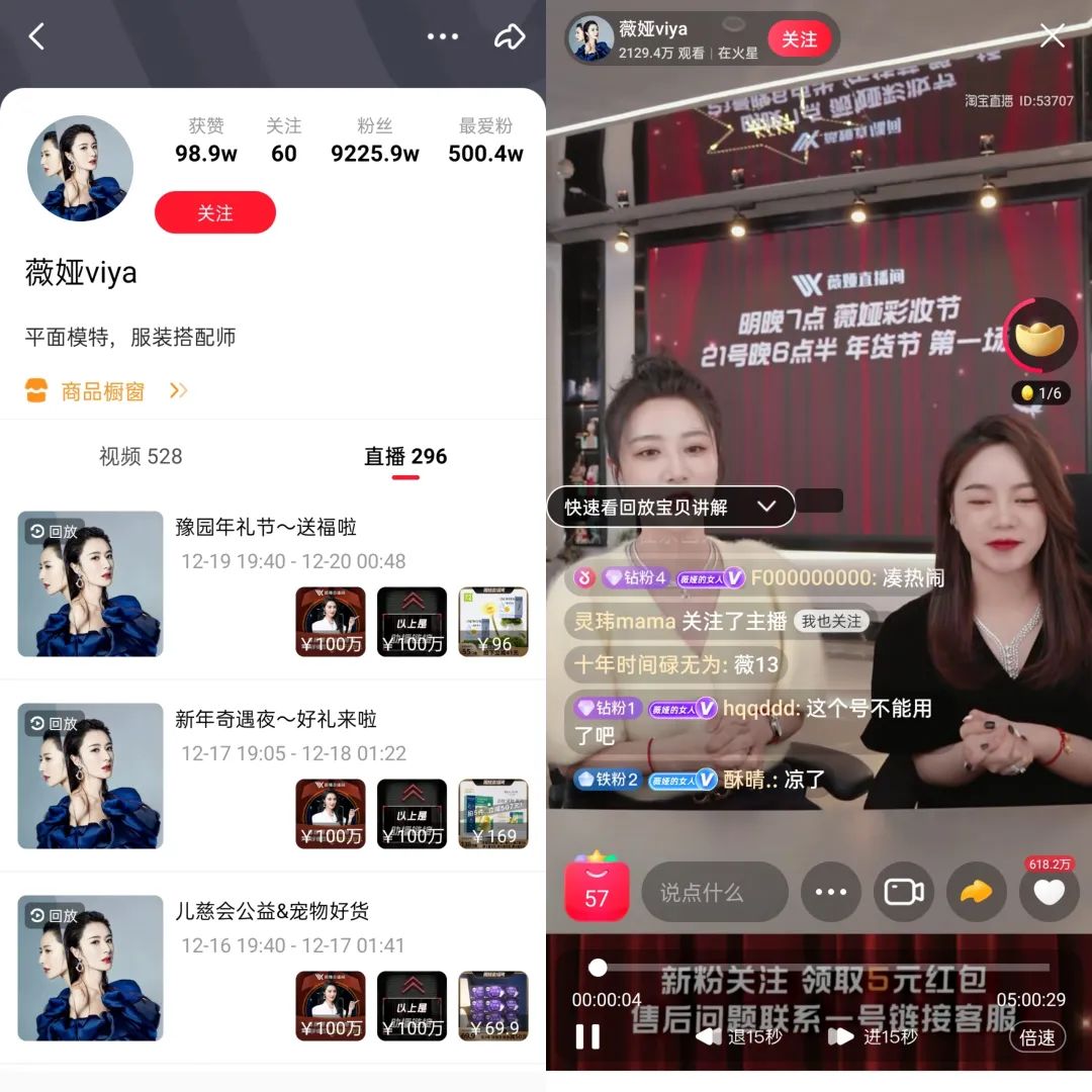过去五年间,薇娅逐步成长为淘宝直播的头部主播,在点淘(原淘宝直播)APP的粉丝量达9226万,还频频出现在各类综艺和活动上。