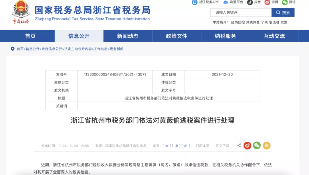 薇娅偷逃税的官方通告,图源国家税务总局浙江省税务局官网