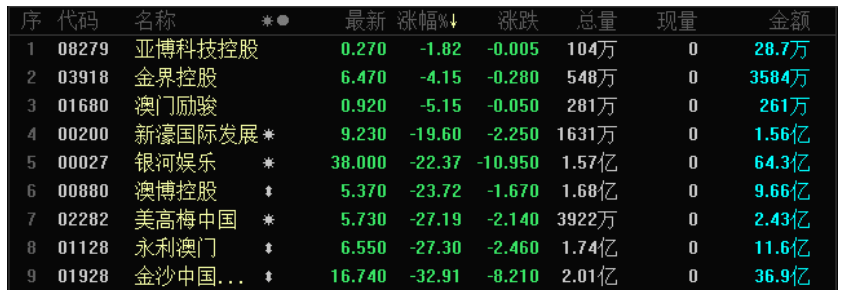 澳门六大博企的港股股价集体下跌,市值千亿的金沙中国跌得最惨,暴跌超30%,稍微好一点的银河娱乐,也跌去18.28%,其他几家跌幅也都在20%-30%之间。
