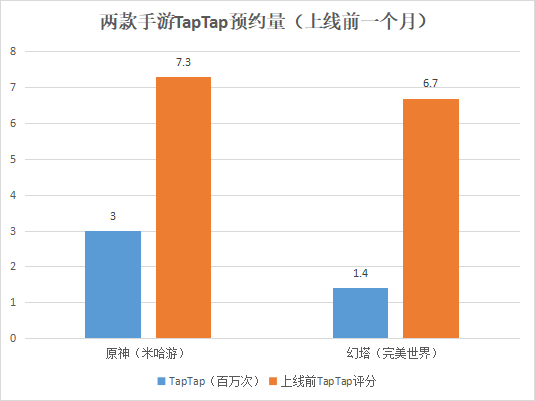从游戏预约/评分来看:《幻塔》与《原神》相差不大。游戏上线前一个月,《幻塔》在TapTap预约量为140.26万人次,而《原神》预约量约为300万人次 。游戏评分方面,《幻塔》上线前评分约为6.7分,与《原神》上线前的7.3分相差不大。