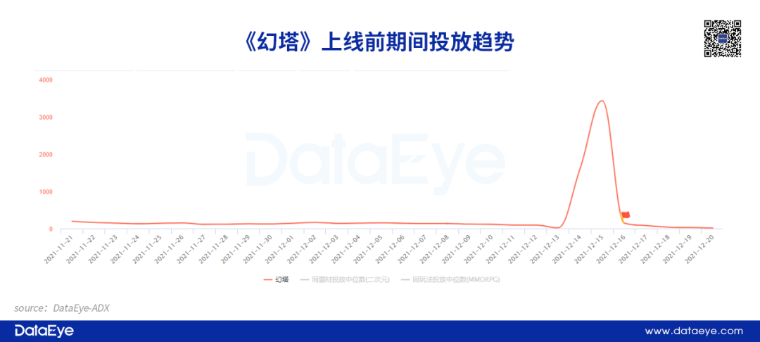 而《幻塔》日均投放素材约为285组,游戏上线时期投放力度略高于《原神》。原因是《幻塔》上线前的预下载阶段,突然提高了投放力度,单日投放素材组高达3400余组,拉高日均投放量。而在游戏上线后,投放量立即下降,并保持较低的效果广告投放。