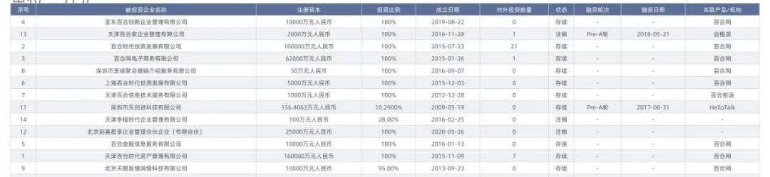 这暗示了之后的动作。据企查查显示,百合佳缘先后投资了包括天津百合时代资产管理有限公司、深圳市美缘聚合婚姻介绍服务有限公司、北京天赐良缘网络科技有限公司等,涉及广告、婚礼咨询、金融等,关联产品有恋爱记等。