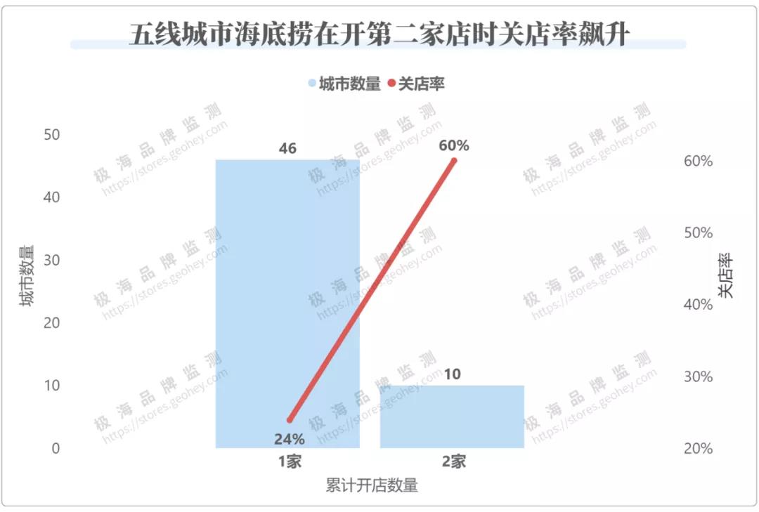 但这些城市的市场容量的确有限,大多数五线城市就只能支撑1家海底捞。我们分析了海底捞在五线城市的开店情况,只开过一家门店的有46个城市,关店率只有24%,接近平均水平。开过2家门店的有10个城市,他们的关店率直接飙升到60%,20家门店就关掉了12家,这也解释了五线城市关店率如此之高的真正原因。