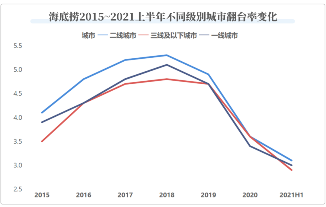 根据国信证券的测算,3次/天的翻台率是海底捞单店的盈亏平衡线。我们查阅了海底捞历年财报的数据,2021年上半年,三线及以下城市翻台率跌至2.9,低于测算值,同时顾客人均消费也是最低的,不足百元,似乎支撑了这一结论。