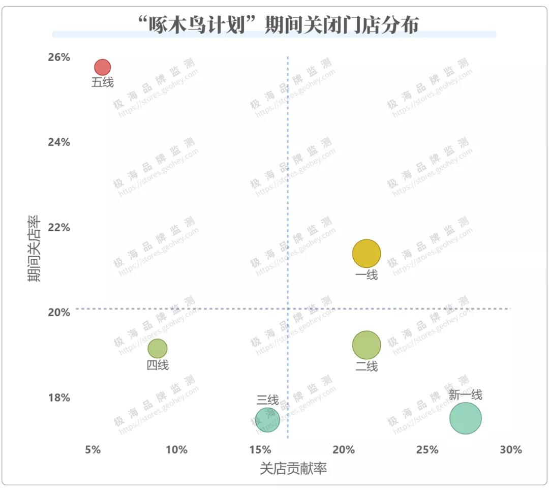 从“啄木鸟计划”执行的目标而言,五线城市虽然关店率最高,但基数小,关店数量不到总数的6%,并非是此次计划的主因。同为下沉市场的三四线城市无论是关店的贡献率(关闭门店占总关店数的比例)还是关店率本身,都比二线及以上城市低得多。