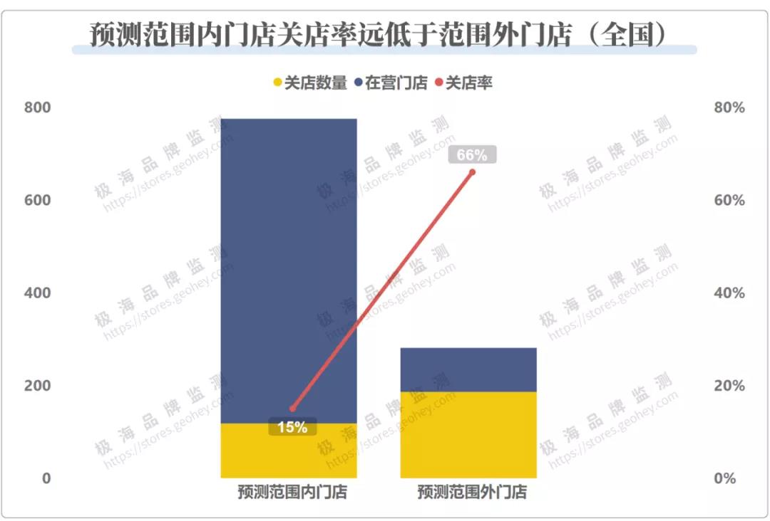 最后,再分别计算分布在我们预测范围内门店的关店率,分布在我们预测区域外门店的关店率,通过比较二者的关店率来评估海底捞选址质量。