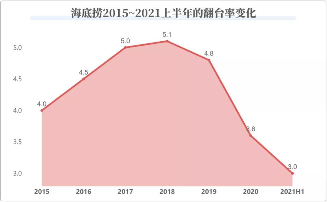 海底捞2021年上半年的财报显示,海底捞整体翻台率已经从2019年的4.8降至2020年的3.6,2021年上半年更是接近3次/天,接近海底捞的盈亏平衡点。