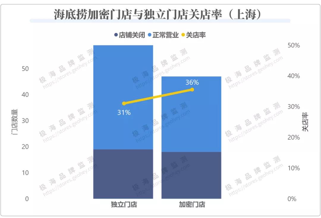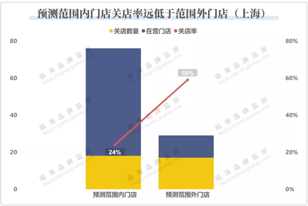 上海累计106家门店,有76家门店在我们的预测范围内,其中58家在营,18家关闭,关店率24%,低于海底捞在上海的平均关店率;不在我们预测范围内的门店有29家,其中就有17家关店,关店率接近6成,远高于预测范围内的门店。