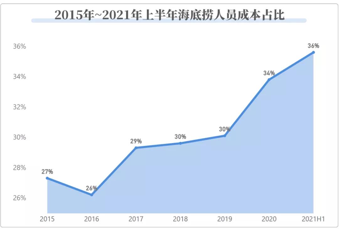 但这也带来了另一个问题,那就是人员成本的居高不下。2021年上半年,海底捞员工数激增至140505人,员工成本为71.62亿元,同比增长了75.8%,该项成本占收入35.6%,无论是人均收入还是占比,都远远高于其他同行。