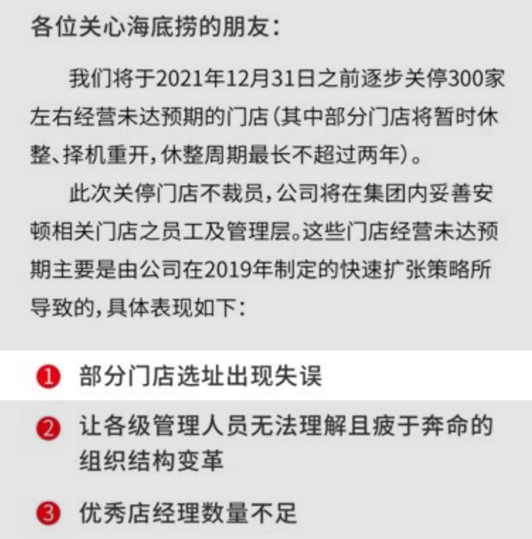 答案其实也简单,就躺在海底捞的对外公告里——选址失误。