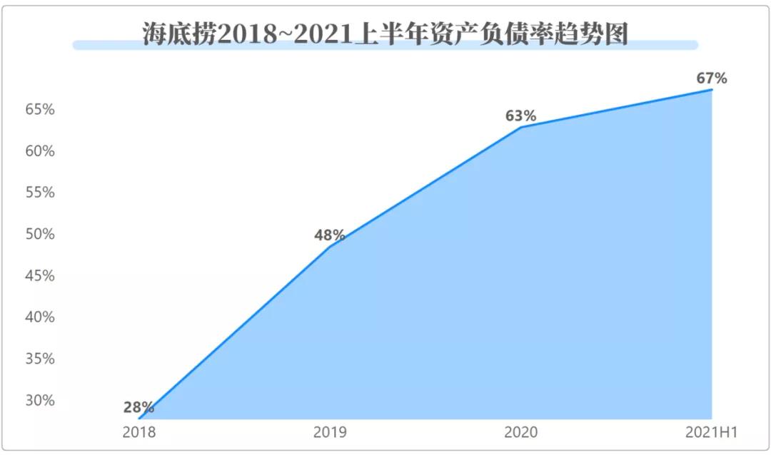 11月12日,海底捞再次发布公告,拟以每股20.43港元配售1.15亿股,募集超过23亿港元,其中30%用于偿还银行贷款融资。募资的背后,是门店快速扩张导致的企业资产负债率飙升。