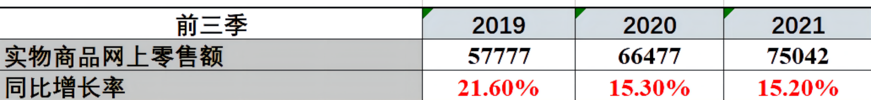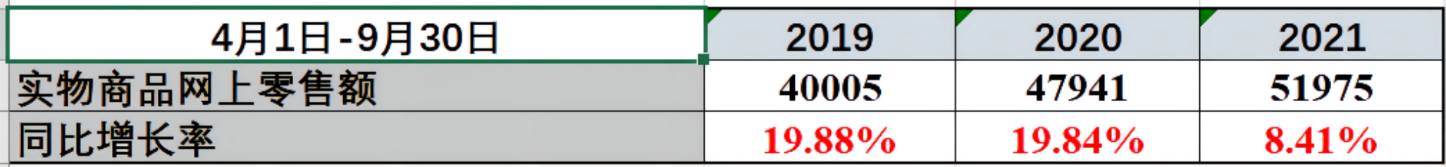 您会发现,京东净利润下滑的原因,首先在于毛利润率的下降。而更主要的在营销费用率和履约费用率的上升。尤其营销费用率升幅最大。这说明京东为了获得收入,不得不投入更多的营销和物流成本。为什么会这样呢?我们从统计局“实物商品网上零售额”数据可以看出端倪: