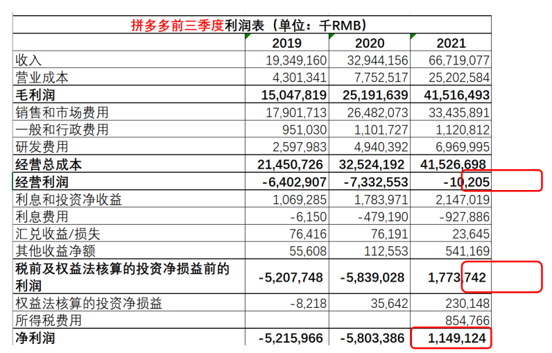 多年亏损的拼多多,今年前三季度居然盈利了!主营业务的经营利润亏损大幅缩小。而且,再分析利润表的数据,会看到更有意思的现象: