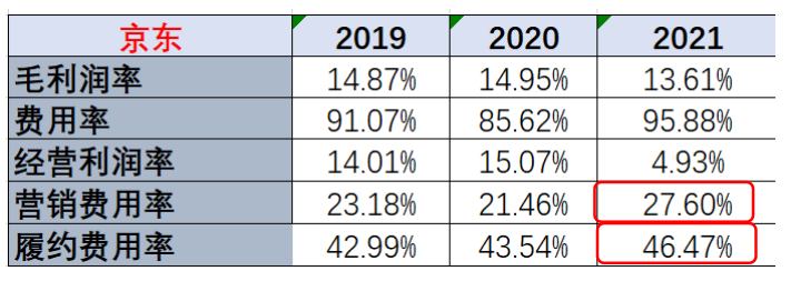 您会发现,虽然今年前三季度的“实物商品网上零售额”同比增速相对稳定,但是第二季度和第三季度的同比增速却大幅下滑到了8.41%。说明整个电商行业的销售增速都在放缓。这也就难怪京东的营销和履约费用率大幅上升了。看来,京东遭遇到了市场的寒流。