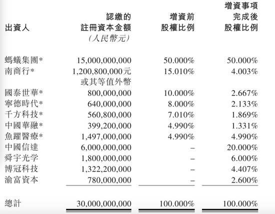 多家公司参与此次出资,具体来看,蚂蚁集团出资110亿元、中国信达出资60亿元、鱼跃医疗出资10.98亿元、舜宇光学、博冠科技、渝富资本分别出资18亿元、13.22亿元和7.8亿元。