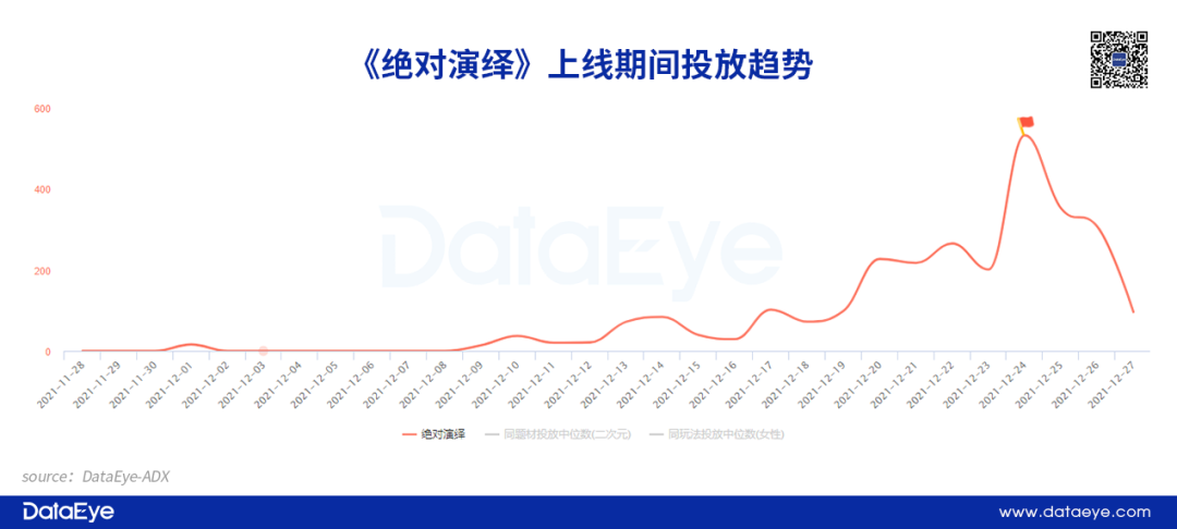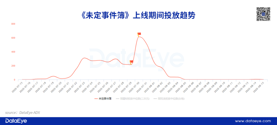 关键词2:大胆。即便产品在上线时加大投放规模,其投放峰值不过千组已经成为一种常态。但在今年的女性向市场中,也有厂商大胆采用完全不一样的投放策略。