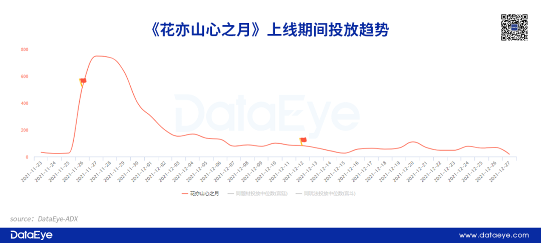 今年“财大气粗”的字节跳动带来了自家第一款自研精品——《花亦山心之月》。尽管产品属于内部高度重视项目,但整体投放力度并不强势,近一个月日均投放素材组约为159余组,投放高峰出现在游戏最后一次不删档内测后,达到748组。即使在游戏正式上线当天,项目组也没有加大投放力度。