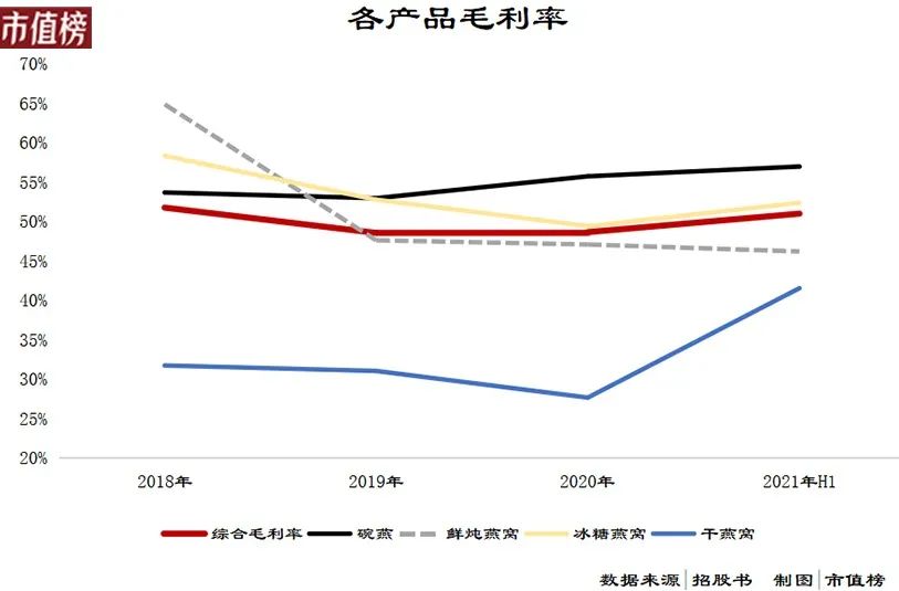 从图中可以看出,2019年和2020年,毛利率明显低于2018年。具体拆分下去,碗燕基本保持高端,鲜炖燕窝和冰糖燕窝竞争压力较大。