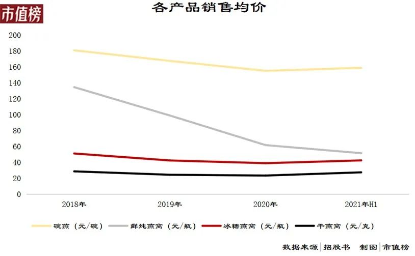 从2018年到2020年,全线产品价格都在下调,鲜炖燕窝的下调幅度最大,牺牲利润换取收入规模的策略非常明显。